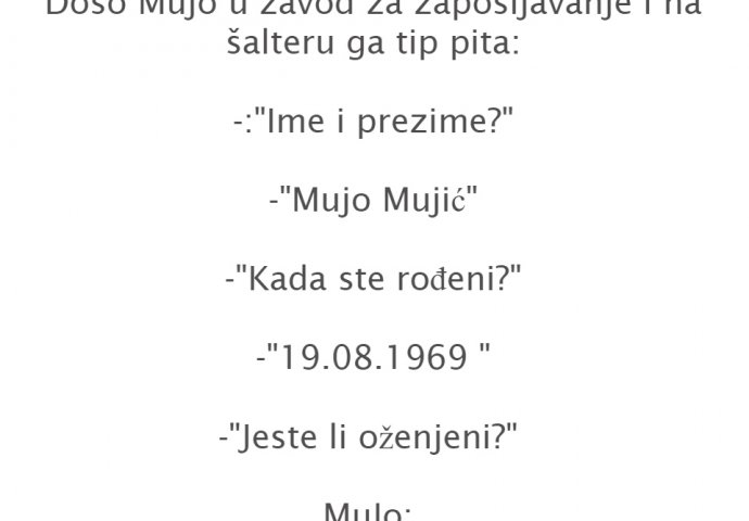 Došo Mujo u zavod za zapošljavanje i na šalteru ga tip pita: