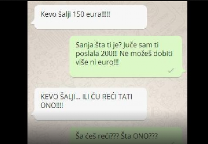 KĆERKA JE TRAŽILA 150 EURA, A KADA SAM ODBILA ZAPRIJETILA MI JE DA ĆE REĆI MUŽU: Ovako nisam odgojila kćerku, UŽAS! Kiosk 31.12.19. 17:48 . KĆERKA JE TRAŽILA 150 EURA, A KADA SAM ODBILA ZAPRIJETILA MI JE DA ĆE REĆI MUŽU: Ovako nisam odgojila kćerku, UŽAS! Ostatak chata pogledajte ispod: