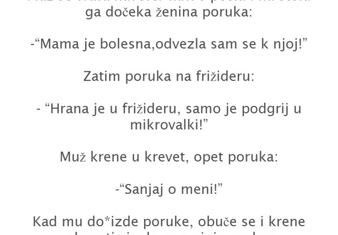 Muž se vraća navečer kući s posla i na stolu ga dočeka ženina poruka: