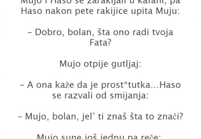 Mujo i Haso se zarakijali u kafani, pa Haso nakon pete rakijice upita Muju:
