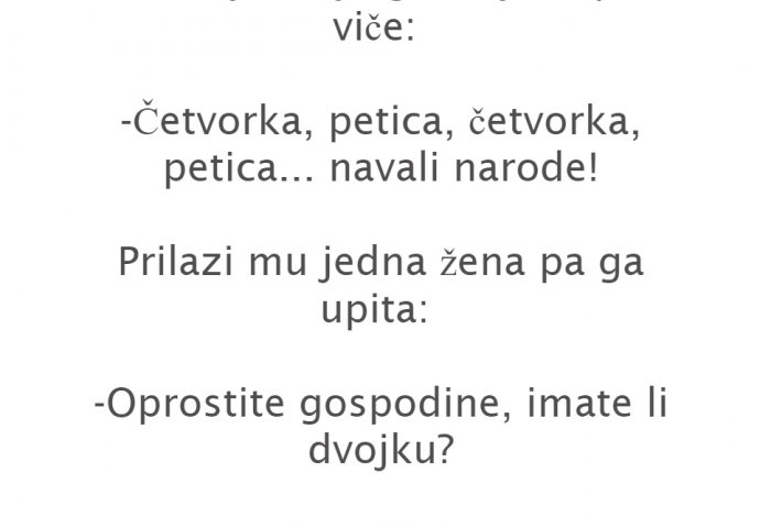 VIC: MUJO PRODAJE GRUDNJAKE Kiosk 16.11.20. 10:05 . Prodaje Mujo grudnjake pa viče: -Četvorka, petica, četvorka, petica... navali narode! Prilazi mu jedna žena pa ga upita: -Oprostite gospodine, imate li dvojku? Kaže Mujo: ...........