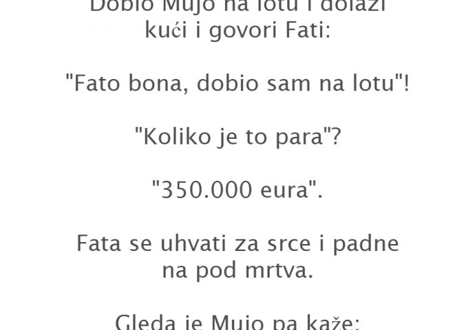 VIC: MUJO DOBIO NA LOTU! Kiosk 12.01.20. 19:29 . Dobio Mujo na lotu i dolazi kući i govori Fati: "Fato bona, dobio sam na lotu"! "Koliko je to para"? "350.000 eura". Fata se uhvati za srce i padne na pod mrtva. Gleda je Mujo pa kaže: "Kad te hoće, stvarno te hoće".