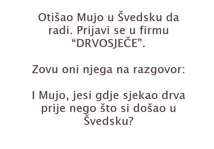 Otišao Mujo u Švedsku da radi. Prijavi se u firmu “DRVOSJEČE”.