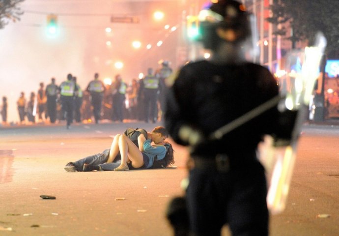 4. Australijanac Scott Jones ljubi svoju djevojku, Kanađanku Alexu Thomas, nakon što ju je na zemlju oborio policajac tokom nereda u Vancouveru. Kanađani su pravili nerede nakon što su Vancouver Canucksi izgubila Stanley Cup od Boston Bruinsa.