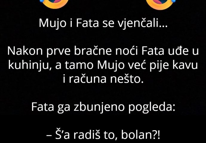 Nakon prve bračne noći Fata uđe u kuhinju, a tamo Mujo već pije kavu i računa nešto.