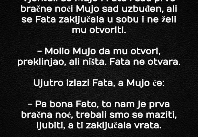 Vjenčali se Mujo i Fata i sad prve bračne noći Mujo sad uzbuđen, ali se Fata zaključala u sobu i ne želi mu otvoriti.