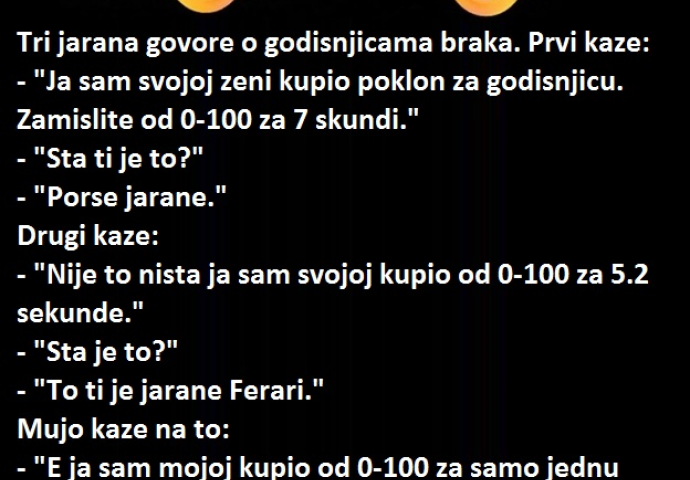 - Ja sam svojoj ženi kupio poklon za godišnjicu. Zamislite od 0-100 za 7 sekundi.