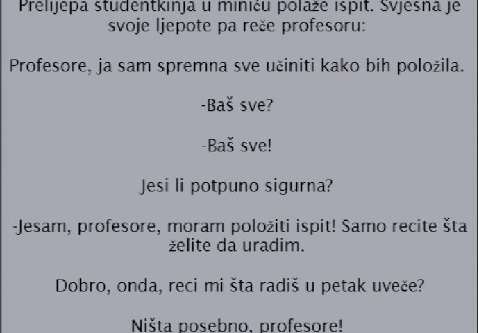 Prelijepa studentkinja u miniću polaže ispit.Svjesna je svoje ljepote pa reče profesoru: