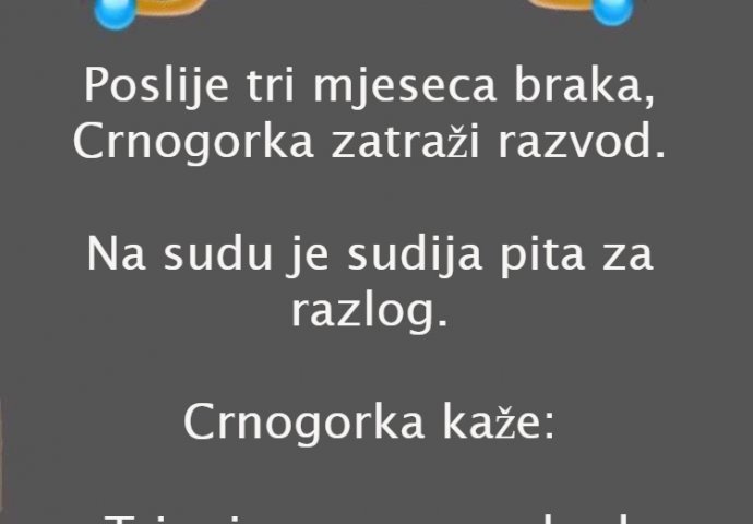 Poslije tri mjeseca braka, Crnogorka zatraži razvod.