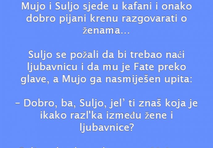 – Dobro, ba, Suljo, jel’ ti znaš koja je ikako razl'ka između žene i ljubavnice?
