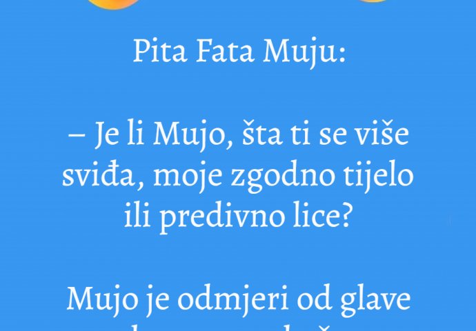 – Je li Mujo, šta ti se više sviđa, moje zgodno tijelo ili predivno lice?