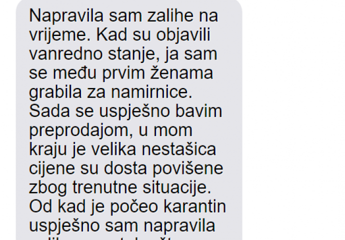 "Napravila sam zalihe na vrijeme. Kad su objavili vanredno stanje, ja sam se među prvim ženama grabila za namirnice