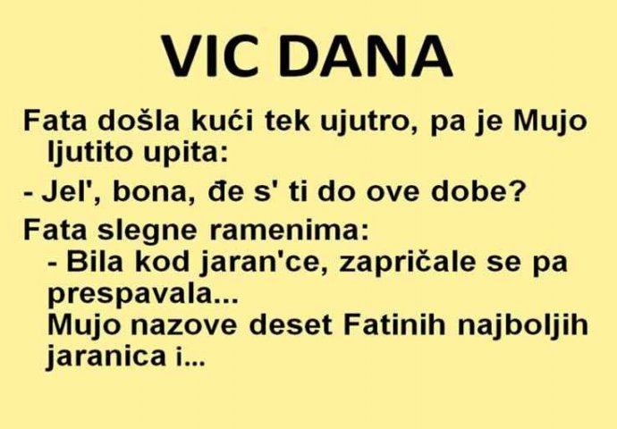 - E moj Mujo, kak'e ti jarane imaš... deset ih nazvala, osam kaže da s' prespav'o kod njih, a dvoj'ca da još spavaš!