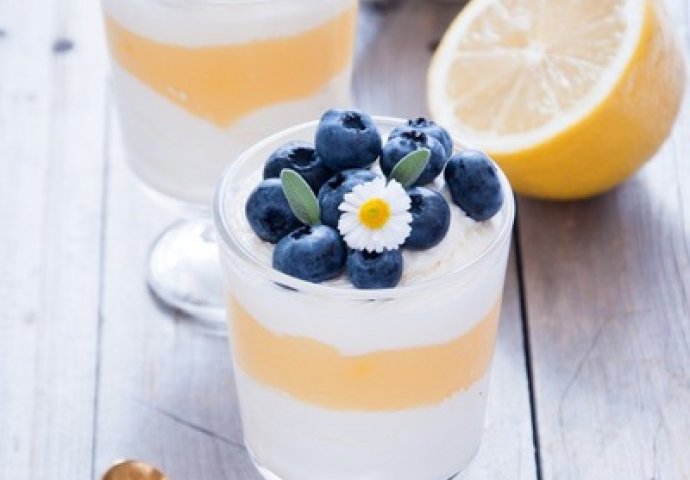 Izlijte u čaše bijelu kremu od sira, zatim preko nje red kreme od limuna te opet do vrha čaše bijelu kremu. Stavite u hladnjak da se kreme stisnu. Ukrasite desert borovnicama.