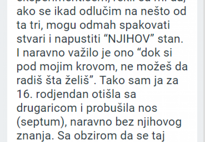"Moji roditelji su striktno protiv pirsinga, farbanja, tetovaža i svega što nije ‘uobičajeno’. " Kiosk 21.04.20. 22:45 .