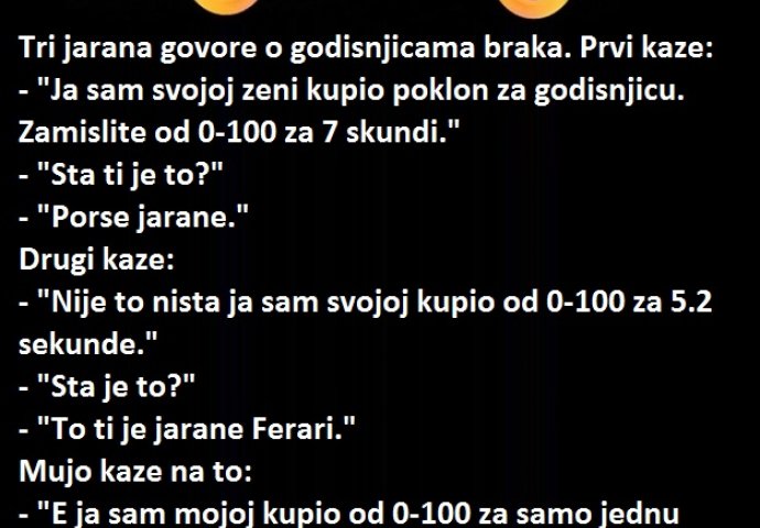 - Ja sam svojoj ženi kupio poklon za godišnjicu. Zamislite od 0-100 za 7 sekundi.