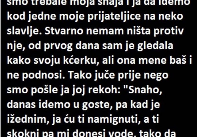 Moj sin se oženio prije nekih mjesec dana i juče smo trebale moja snaja i ja da idemo kod jedne moje prijateljice na neko slavlje. Stvarno nemam ništa protiv nje, od prvog dana sam je gledala kako svoju kćerku, ali ona mene baš i ne podnosi. Tako juče prije nego smo pošle ja joj rekoh: “Snaho, danas idemo u goste, pa kad je ižednim, ja ću ti namignuti, a ti skokni pa mi donesi vode, tako da niko ne zna da ti naređujem… da ne pomisle da te ponišavam i tako to”, A ONA MENI REČE: