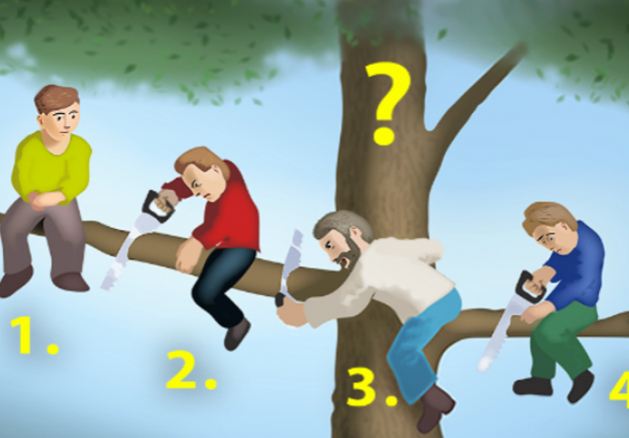 Ali ipak, to što osoba broj 4 izgleda kao da je primorana da pila granu na kojoj sjedi – možda je sklona samoubistvu – možemo zaključiti da je na neki način najmanje svjesna svoje loše pozicije i posljedica koje slijede. S druge strane, osoba 1 posmatra mirno kako joj čak dvoje ljudi pili granu na kojoj sjedi kao da je sasvim nesvjesna onoga što slijedi – što nas dovodi do zaključka da je osoba 1 najgluplja.