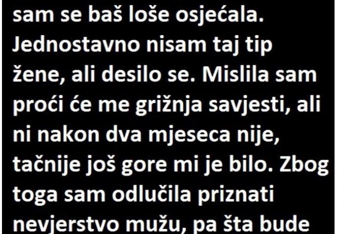 Mislila sam proći će me grižnja savjesti, ali ni nakon dva mjeseca nije, tačnije još gore mi je bilo. Zbog toga sam odlučila priznati nevjerstvo mužu, pa šta bude da bude.