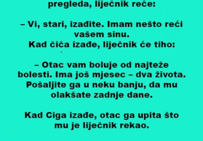 – Otac vam boluje od najteže bolesti. Ima još mjesec – dva života. Pošaljite ga u neku banju, da mu olakšate zadnje dane.