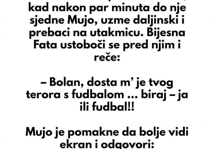 Fata se uvalila pred televizor, kad nakon par minuta do nje sjedne Mujo, uzme daljinski i prebaci na utakmicu. Bijesna Fata ustoboči se pred njim i reče: