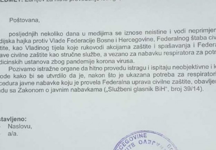 U zahtjevu je također navedeno kako se posljednjih dana u medijima  iznose neistine i vodi neprimjerena kampanja protiv Vlade Federacije BiH, Federalnog štaba civilne zaštite kao vladinog tijela koje rukovodi akcijama zaštite i spašavanja i Federalne uprave civilne zaštite kao stručne službe, a u vezi sa nabavkom respiratora za potrebe medicinskih ustanova zbog pandemije koronavirusa.