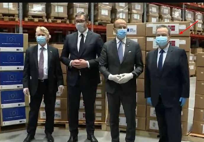 - Pošto su predsjednik Srbije Aleksandar Vučić, norveški ambasador Jern Eugene Jelstad i šef Delegacije EU u Srbiji Sem Fabrici obišli magacin u kojem je izvršena primopredaja medicinske opreme koju su Srbiji darovale Norveška i EU, Vučić je visoke zvanice pozvao da se zajedno fotografišu pored kutija na kojima piše Kraljevina Norveška.