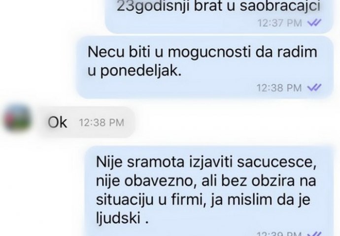 U prilogu vam donosimo razgovor jedne žene koja je tek saznala da joj je brat preminuo, i kao dobar zaposleni kao što jeste, javila je za situaciju svom nadležnom i najavila se da će narednih par dana biti odustna. Međutim odgovor koji je dobila od svog šefa ju je u najmanju ruku razočarao. U ovim teškim trenucima ona nije imala vremena da se bori u tom trenutku sa tim, ali nakon par dana odlučila je da podijeli sa svijetom koliko se to tužne stvari dešavaju na našim prostorima, i koliko su ljudi postali bezosjećani jedni prema drugima.