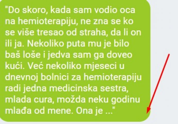Nekoliko puta mu je bilo baš loše i jedva sam ga doveo kući. Već nekoliko mjeseci u dnevnoj bolnici za hemioterapiju radi jedna medicinska sestra, mlada cura, možda neku godinu mlađa od mene.