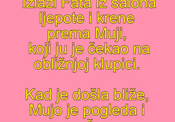 VIC DANA: Fata je pokušala Kiosk 11.05.20. 09:32 . Izlazi Fata iz salona ljepote i krene prema Muji, koji ju je čekao na obližnjoj klupici. Kad je došla bliže, Mujo je pogleda i reče: - Ajde, pa barem si pokušala!