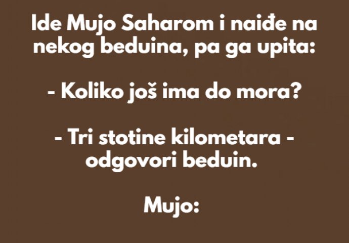 VIC: Ide Mujo Saharom Kiosk 13.05.20. 18:23 . Ide Mujo Saharom i naiđe na nekog beduina, pa ga upita: - Koliko još ima do mora? - Tri stotine kilometara - odgovori beduin. - Dobra vam plaža, ali je more daleko! - reče mu Mujo.