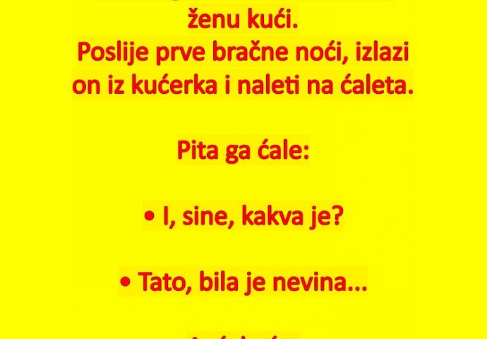 Poslije prve bračne noći, izlazi on iz kućerka i naleti na ćaleta.