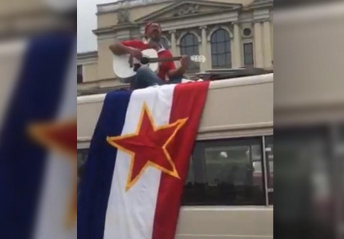 Muškarac sa gitarom sjeo je na zastavu SFRJ sa petokrakom postavljenu na vrh kombija ispred muzeja i zapjevao.