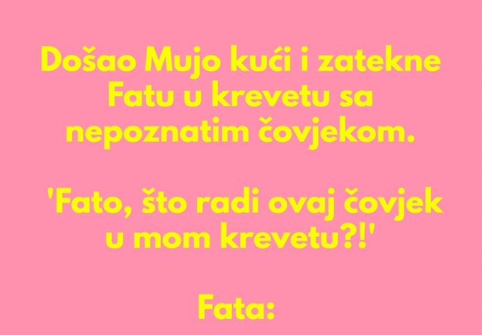 VIC DANA: Mujo zatekao Fatu u krevetu sa drugim Kiosk 18.05.20. 12:58 . Došao Mujo kući i zatekne Fatu u krevetu sa nepoznatim čovjekom. 'Fato, što radi ovaj čovjek u mom krevetu?!' 'Čuda, Mujo! Čuda radi!'