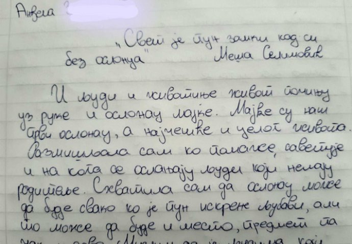 "I ljudi i životinje život počinju uz ruke i oslonac majke. Majke su nam prvi oslonac, a najčešće i cijelog života", glasi početak Anđelinog sastava, a u nastavku je, misleći na one koji nemaju roditelje, dodala da oslonac može da bude svako pun iskrene ljubavi.