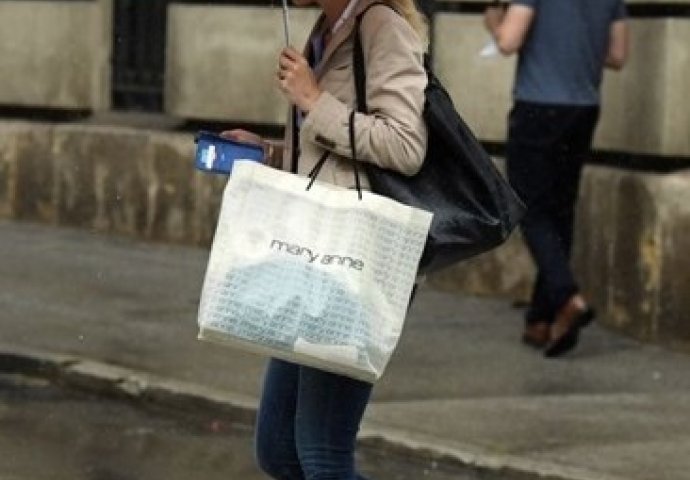 Na noge je navukla dvije vrećice te se tako na snalažljiv način zaštitila od klizanja na mokroj površini, a ujedno je i zaštitila svoje tenisice od prokišnjavanja.