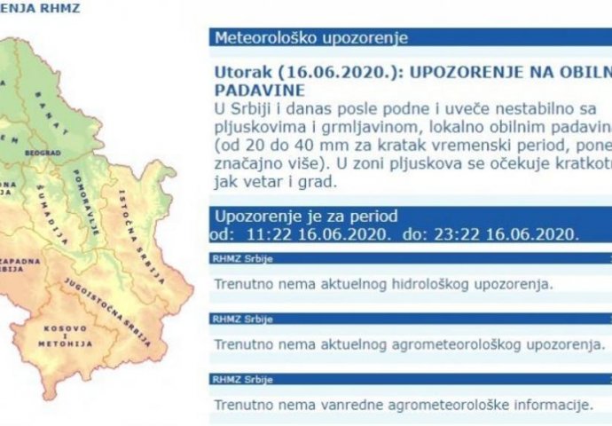 Republički hidrometorološki zavod upozorio je da su danas u Srbiji lokalno moguće obilne padavine, od 20 do 40 mm za kratko vrijeme, ponegde i više.