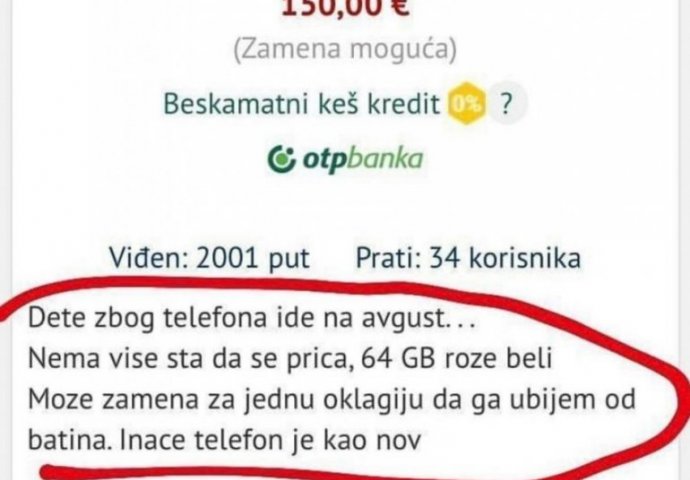 - Dijete zbog telefona ide na avgust. Nema više šta da se priča! Može zamjena za oklagiju, da ga ubijem od batina. Inače, telefon je kao nov - napisali su oni, a slika oglasa je masovno počela da se širi na internet stranicama.