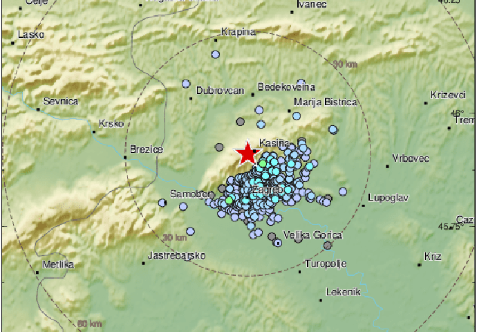 Dubina potresa, odnosno hipocentar potresa bio je na jednom kilometru, a epicentar je bio 11 kilometara sjeverno od Zagreba te na četiri kilometra jugozapadno od Kašine, objavio je EMSC.