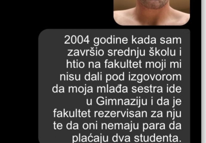 "2004 godine kada sam završio srednju školu i htio na fakultet moji mi nisu dali pod izgovorom da moja mlađa sestra ide u Gimnaziju i da je fakultet rezervisan za nju te da oni nemaju para da plaćaju dva studenta.