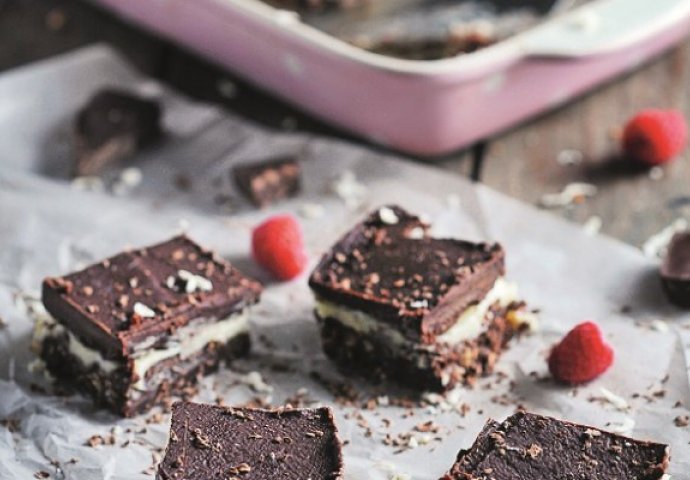 Otopite bijelu čokoladu s 5 jušnih žlica vrhnja i 2 jušne kašike mlijeka u prahu. Ako želite izbjeći mlijeko u prahu, samo otopite bijelu čokoladu s manje vrhnja. Smjesa treba također biti kompaktna da se može razmazivati. Ako vam je rijetka, stavite je u hladnjak da se stisne, a kad je gotova, rasporedite je po prvom sloju koji ste pripremili. Hladite 30 minuta do trećeg sloja.