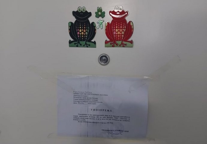 - Upozoravaju se sva zainteresovana lica da je ovaj stan zapečaćen od strane pripadnika policije PU za grad Beograd, UKP - Odjeljenje za uviđajno-operativne poslove i da se isti ne smije otvoriti bez odobrenja pomenute službe - ističe se u upozorenju