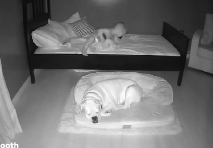 Kako bi provjerili radili to svake noći, postavili su kameru koja je zabilježila kako beba ustaje, silazi sa kreveta i leže pored psa koji mu povremeno služi kao jastuk.