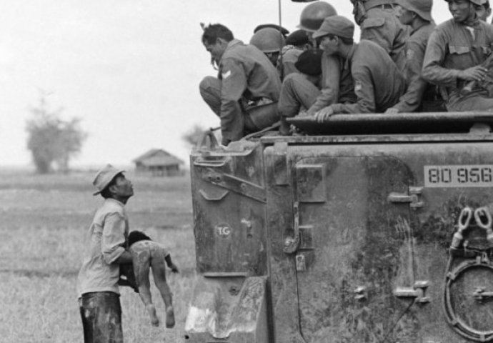 Na ovoj fotografiji otac drži mrtvo dijete u rukama dok ga sa vojnog kamiona nijemo posmatraju vojnici vojske Južnog Vijetnama.