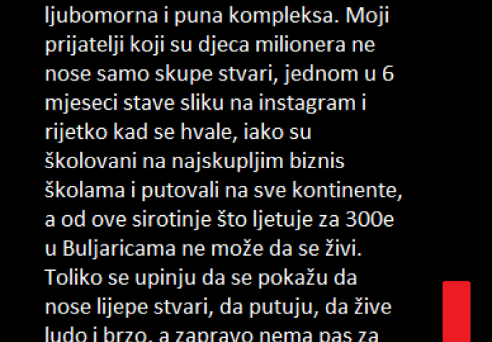 Moji prijatelji koji su djeca milionera ne nose samo skupe stvari, jednom u 6 mjeseci stave sliku na instagram i rijetko kad se hvale, iako su školovani na najskupljim biznis školama i putovali na sve kontinente, a od ove sirotinje što ljetuje za 300e u Buljaricama ne može da se živi. Toliko se upinju da se pokažu da nose lijepe stvari, da putuju, da žive ludo i brzo, a zapravo nema pas za šta da ih ujede.