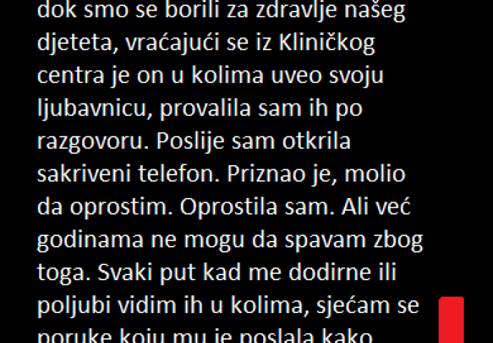 U trenutku dok smo se borili za zdravlje našeg djeteta, vraćajući se iz Kliničkog centra je on u kolima uveo svoju ljubavnicu, provalila sam ih po razgovoru. Poslije sam otkrila sakriveni telefon. Priznao je, molio da oprostim. Oprostila sam. Ali već godinama ne mogu da spavam zbog toga. Svaki put kad me dodirne ili poljubi vidim ih u kolima, sjećam se poruke koju mu je poslala kako ništa nisam provalila uz smijanje.