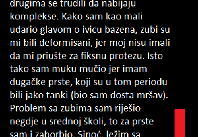 Kako sam kao mali udario glavom o ivicu bazena, zubi su mi bili deformisani, jer moj nisu imali da mi priušte za fiksnu protezu. Isto tako sam muku mučio jer imam dugačke prste, koji su u tom periodu bili jako tanki (bio sam dosta mršav). Problem sa zubima sam riješio negdje u srednoj školi, to za prste sam i zaborbio.