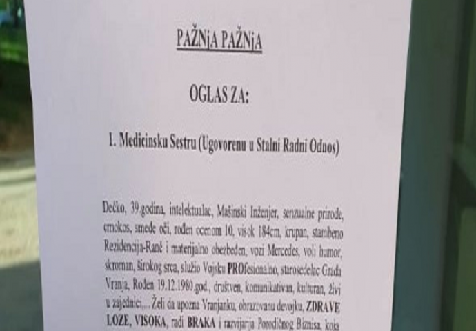 Vranjancima koji su prolazili pored Zdravstvenog centra u srijedu ujutru, pažnju je privukao bijeli papir zalijepljen na vratima centra. Ovaj put, tekst sa papira nije se odnosio na obaveznu upotrebu zaštitnih maski ili nešto slično, već je bio intimnije prirode - oglas za ženidbu.