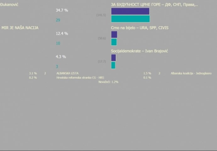 Koalicija "Mir je naša nacija" ima 12,6 posto, "Crno na bijelo" pet posto, Bošnjačka stranka 4,4 posto, Socijaldemokrate 4,3, SDP - Јaka Crna Gora tri posto, Albanska koalicija Јednoglasno 1,1 posto, Albanska lista 1,4 posto, HGI 0,2 posto.
