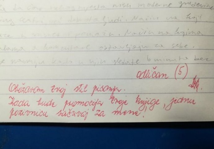 - Kad ti dijete dođe iz škole i pokaže komentar učiteljice na sastav koji je napisala krene suza radosnica jer vidiš koliko je dobrih učitelja koji podstiču, motivišu, ohrabruju učenike u njihovom svakodnevnom školskom zivotu. Takvim učiteljima treba odati priznanje, takve treba nagraditi jer su oni sami nagrada deci. Kapa do poda učiteljice! - kaže ova majka.